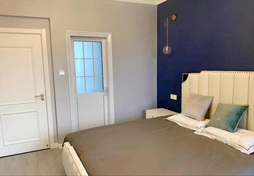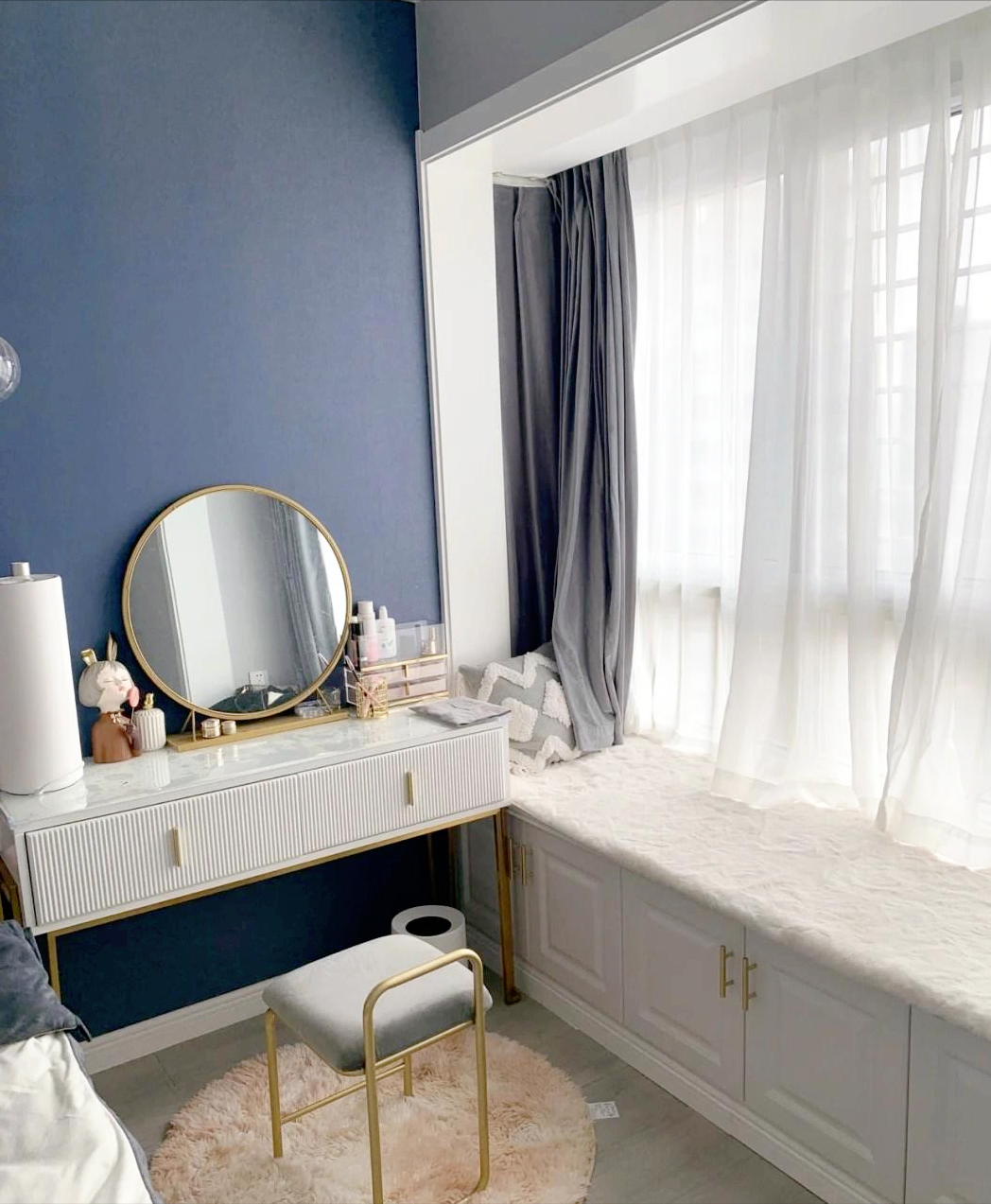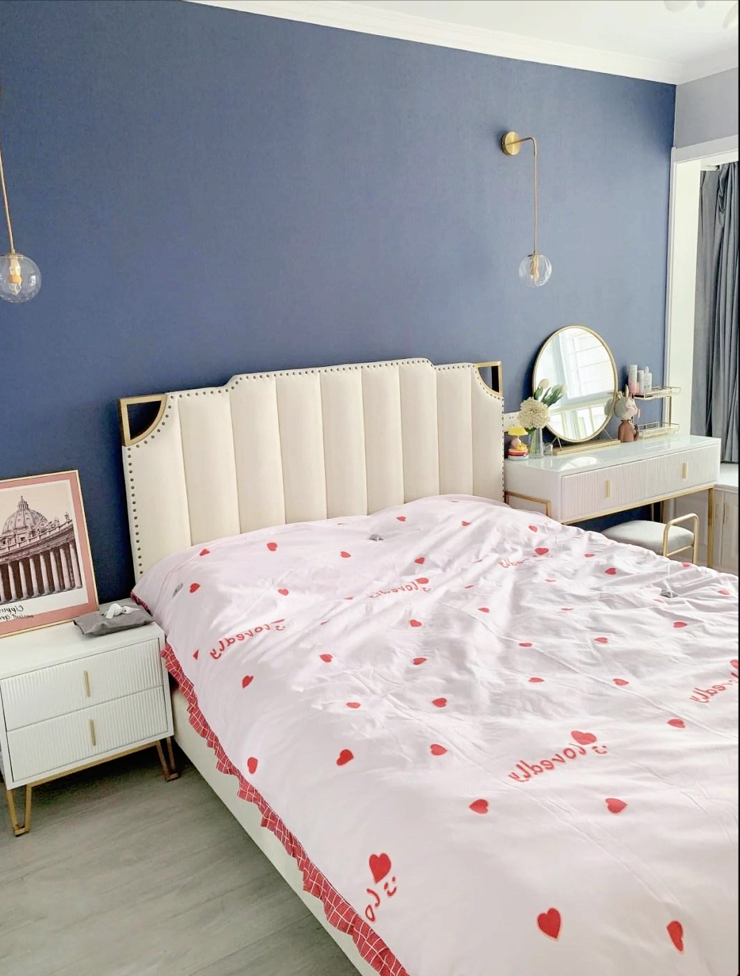 主卧房没有采用吊顶,而是采取用石膏板举行制型▼,这既提拔了房间的空间高度,又避免了匮乏感。墙背和电视墙皆贴上水洗蓝墙布▼,给与了房间温婉高级的气质▼▼。意念不到的是,按照网上的粉饰提示,竟然能获得如许合意的装修收获,真是越看越令人锺爱。