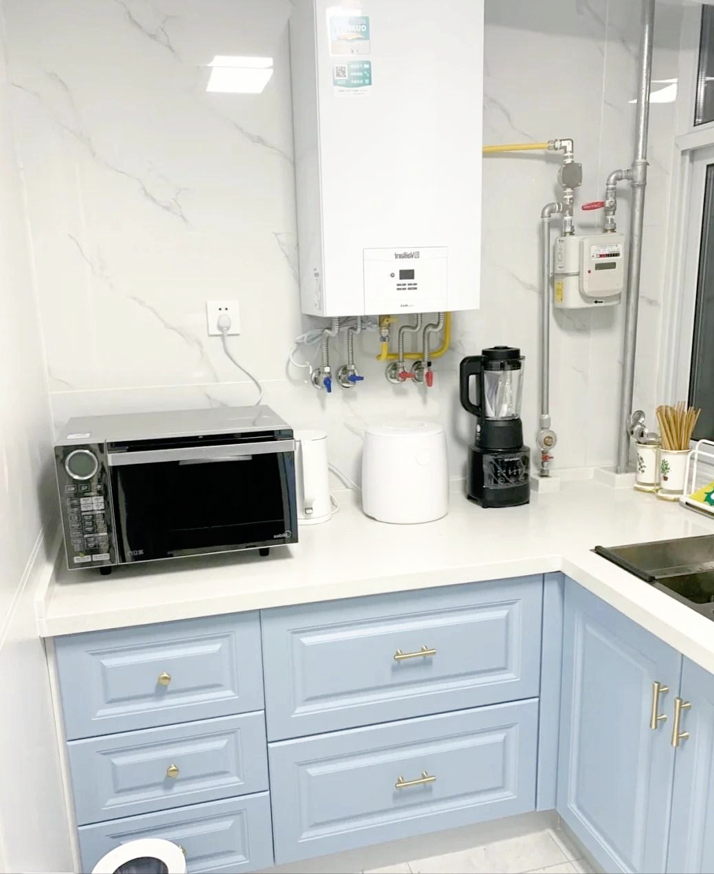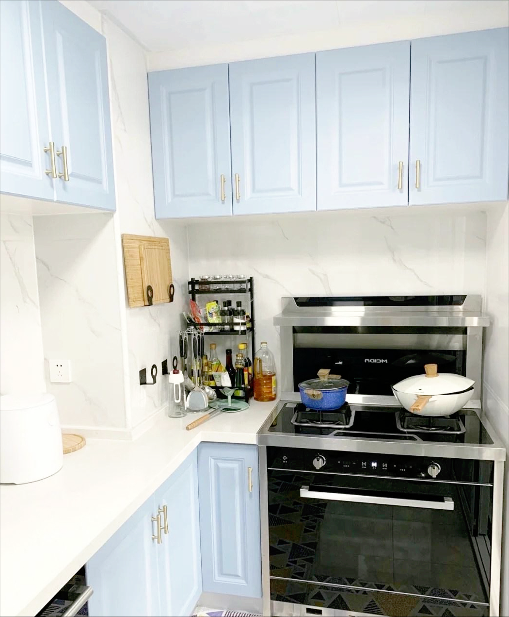 厨房以白色为主调成功案例,墙面和地面明净亮丽,蓝色橱柜配上金属拉手▼▼,清爽又富裕细密的温婉。为了最大化台面空间子全屋贴墙布美丽又高级众数人效仿太获胜了!,特别增设了极少置物架,或许利便地收纳各类调味料瓶罐及厨具,依旧厨房的整洁与卫生。