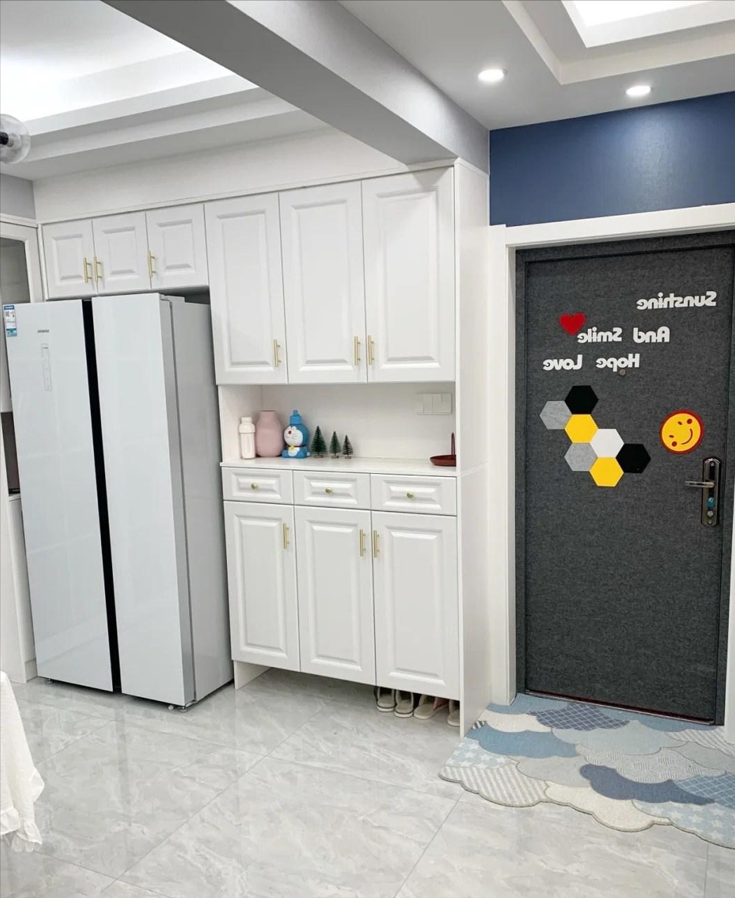 粉饰门采用了毛毡门贴,左侧的鞋柜是定制的▼,其做工和质料都相当杰出。其白色的柜门配以金色的拉手,简明而细密。旁边还十分预留了冰箱的地方,省去了厨房的空间▼,至极适用。