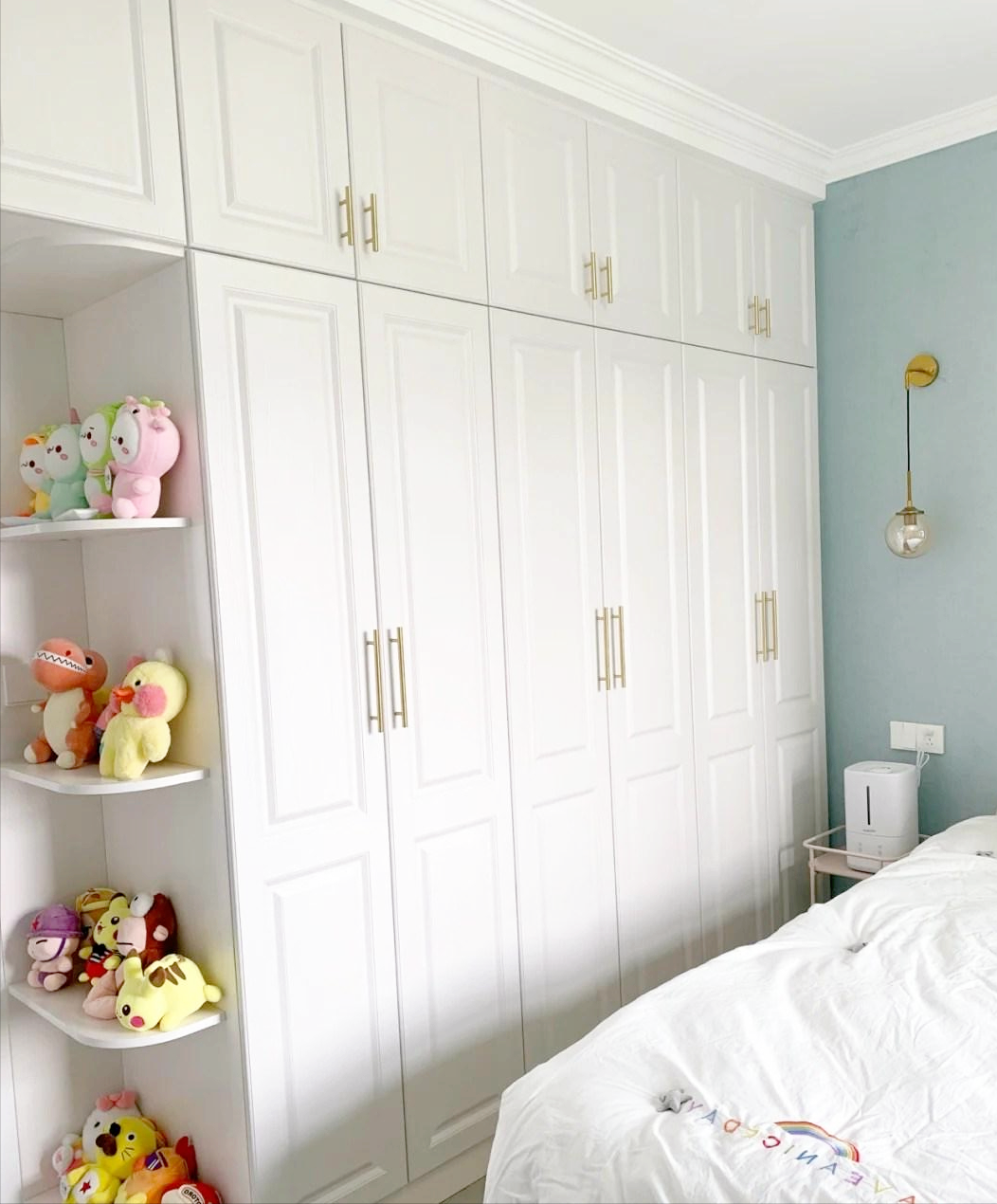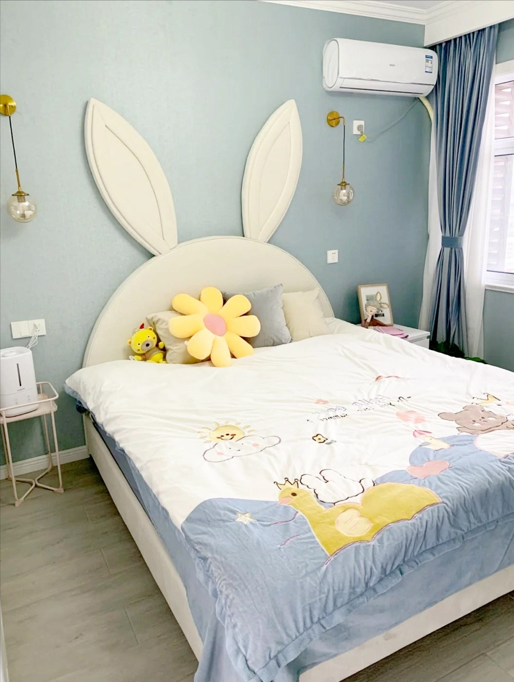 浅蓝色墙布粉饰的儿童房,洁白且令人赏心悦目。兔子床与动物图案床品的相配,尽显萌趣而梦幻的气氛▼▼,深受孩子们的宠爱▼。床侧定制的衣柜,高明地正在亲切大门的一侧计划了弧形绽放格▼,外示出极具人性化的计划理念。