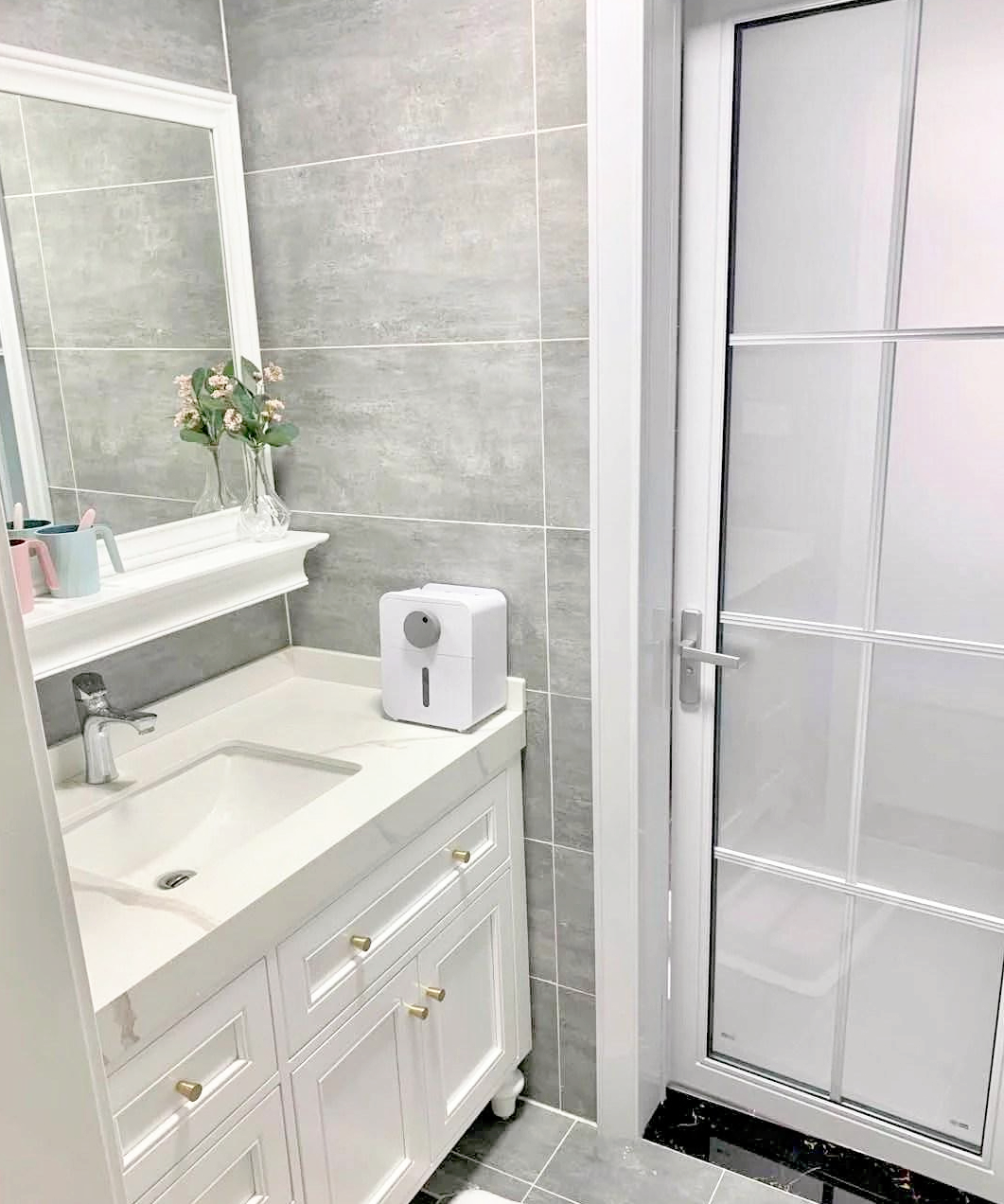 因为公卫的空间较为宽阔,洗漱区被计划正在门外,这极大的提拔了生存恶果。白色的浴室柜和浴室镜与灰色的墙面地面的搭配,外示出一种明净、整洁又浸稳大方的视觉感染。