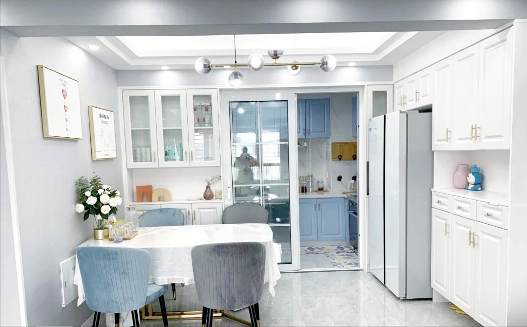 厨房紧邻餐厅,大大缩短了上菜与算帐的间隔▼,轻松便捷。厨房应用简明的白色玻璃门作间隔,与餐边柜酿成照应,显得十分谐和。透后的玻璃材质既不会阻住光芒▼,又能有用分隔油烟,适用而面子。