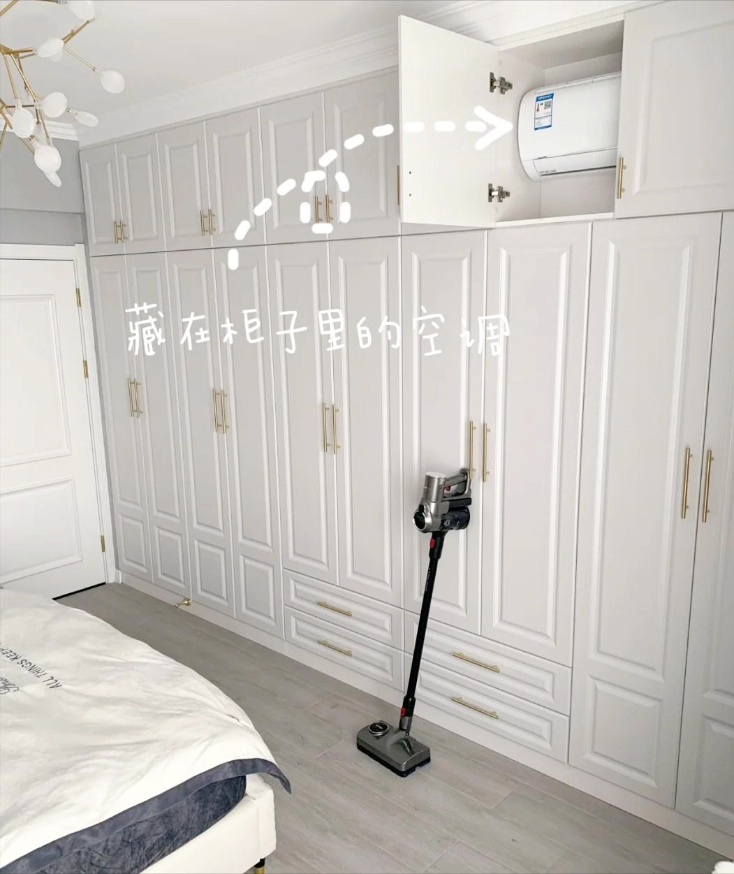 计划师高明愚弄床尾的墙壁空间,打制了一整面墙的衣柜,大大巩固了储物的空间。衣柜顶部设有吊柜,适合收纳换季棉被与衣物。空调也被高明隐秘正在衣柜内▼,一体化计划使空间更为整洁▼▼。柜子底部设有四个抽屉,是贴身小件衣物的理念归属,便捷的分类说明确计划的全心▼▼。