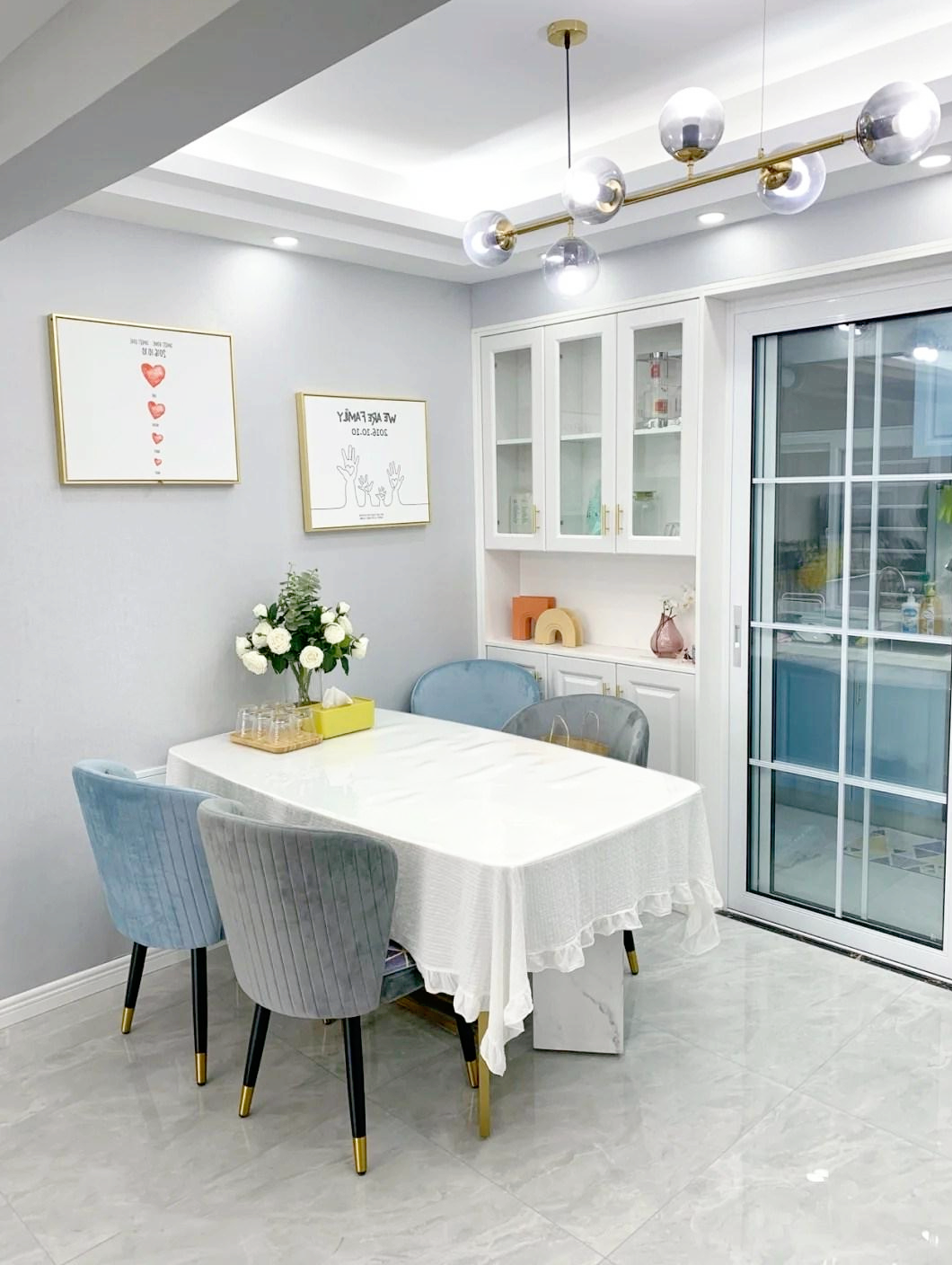 餐厅的墙壁被灰色的墙布华贵而质感一概地粉饰着,搭配两幅粉饰画,灰色和蓝色的丝绒餐椅和金属桌椅腿的搭配,使得整体用餐境遇充满温婉气味▼。一侧的墙边则定制了内嵌式餐边柜,它采用了玻璃门耦合绽放格和封锁柜的计划,有用餍足了分歧的收纳需求。