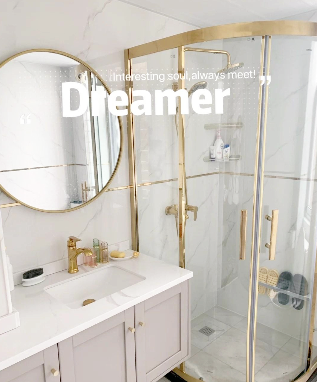 以白色为底子的色调使主卫显得出格通透后亮,假使空间较小。弧形玻璃门间隔的淋浴区正在省俭空间的同时抵达了干湿分袂的效益。浴室镜、浴室柜以及玻璃门框等都应用了金属元素,给与了空间轻奢而温婉的气质▼,气度一概▼▼。