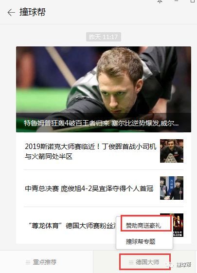 1、进入撞球助公家号菜单栏点击“德邦巨匠赛”-“赞助商送豪礼”板块出席行为